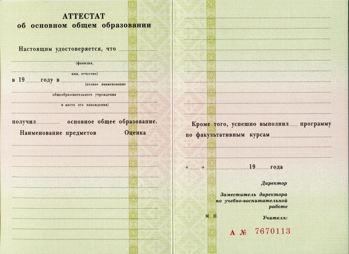 Аттестат за 9 класс 1993-1997 года