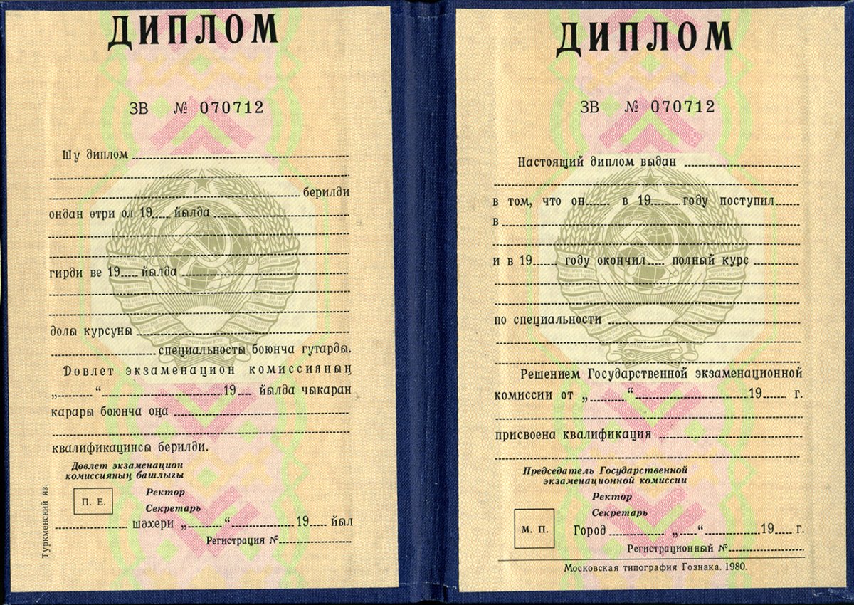Диплом ВУЗа Туркменской СССР